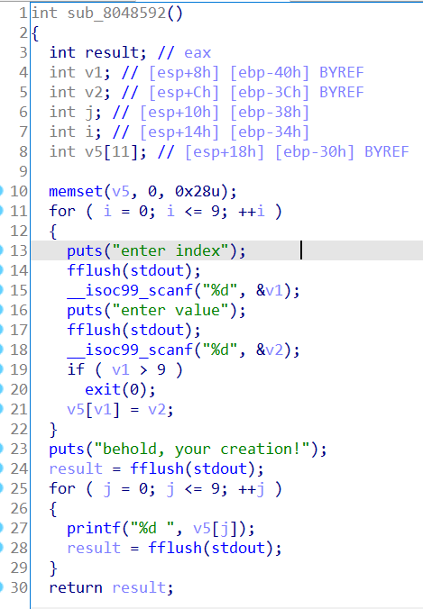 - v1为int,输入负数绕过对v1的检测,v5[v1]时将v1当成unsigned int用,因此可以修改v5后任意地址的值