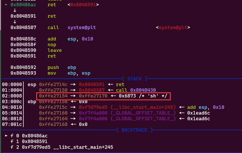 - 返回地址下面有一个栈地址,可以当作sh的指针